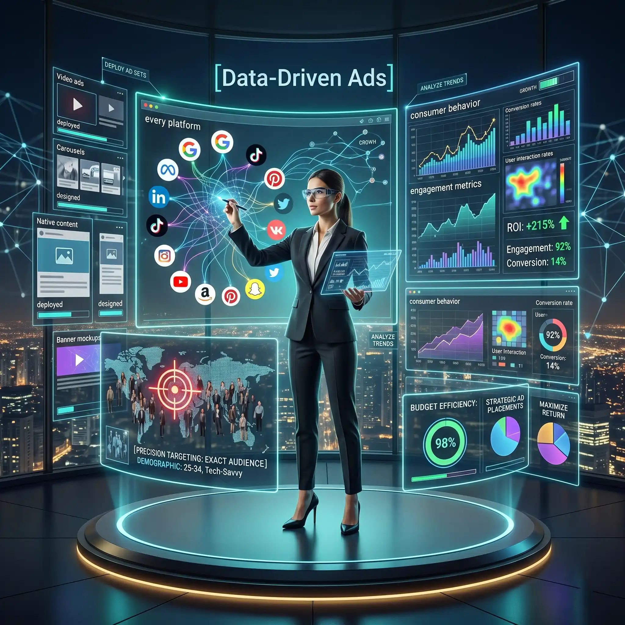 We design and deploy data-driven ads of all sorts across every platform. Reach your exact target audience with precision and maximize your return on investment through strategic ad placements. By analyzing consumer behavior and engagement metrics, we ensure your advertising budget is spent efficiently on the networks that matter most to your business growth.